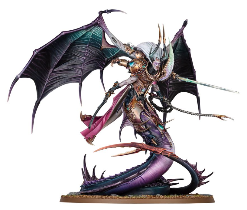 Fulgrim, originalmente el orgulloso líder de los Hijos del Emperador, sucumbió a las tentaciones del Caos y se convirtió en un príncipe demonio al servicio de Slaanesh. Su nueva forma es una manifestación grotesca de su caída, con un cuerpo serpentino y múltiples brazos, reflejando su transformación en una criatura depravada y poderosa