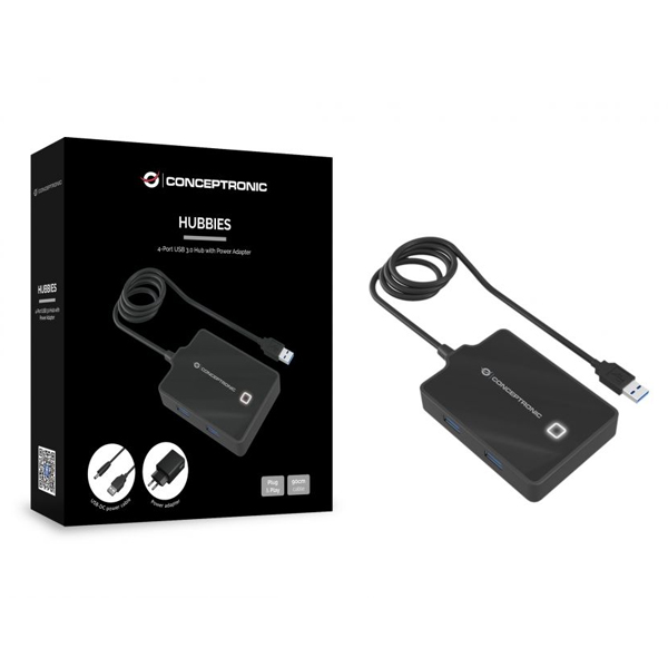 HUB USB3.0 CONCEPTRONIC HUBBIES11B 4 PUERTOS Y CABLE DE 90CM CON ALIMENTADOR