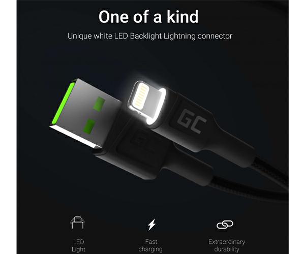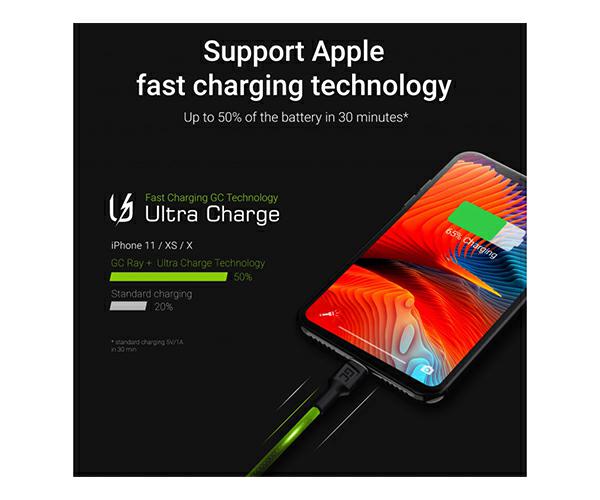 GC Ray USB-A: cable Lightning con una longitud personalizada de 120 cm: carga rápida y transferencia de datos, creado para satisfacer las expectativas de los usuarios más exigentes La delicada iluminación blanca del enchufe Lightning con diodo LED le permitirá conectar GC Ray a su dispositivo sin ningún problema, independientemente de la hora y las condiciones. ¡Olvídate de buscar el cable en la oscuridad! Gracias al soporte para carga rápida de Apple 2.4A y el cable de transferencia de datos de 480Mps es perfecto para sus dispositivos modernos equipados con puerto Lightning Durable en cada pulgada: toda la longitud del cable está protegida por el uso de materiales duraderos y modernos.