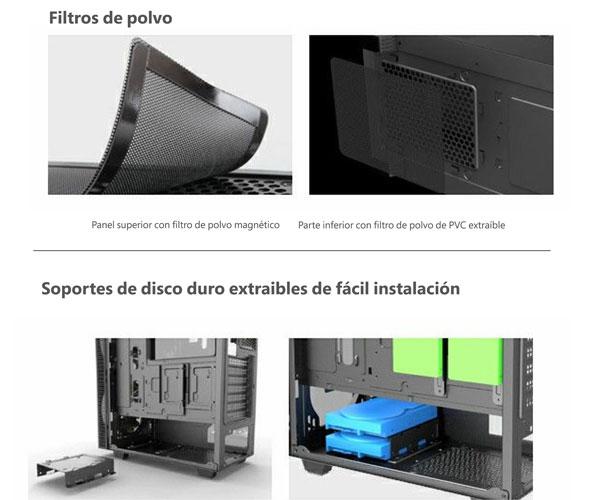 – La refrigeración es importante, por ello cuenta con capacidad para instalar hasta 6 ventiladores al igual que está lista para refrigeración líquida AIO y viene con filtro de polvo superior e inferior, ambos lavables, para mantener a raya el polvo.