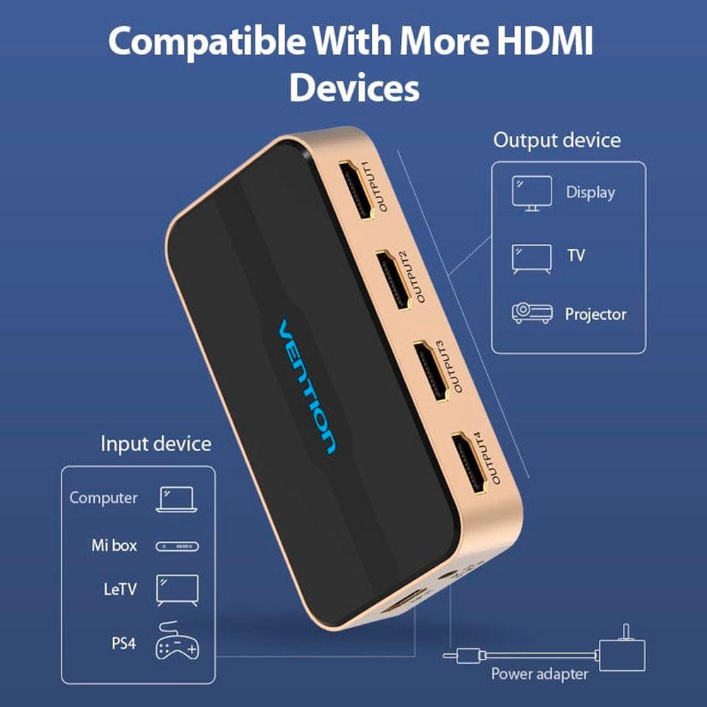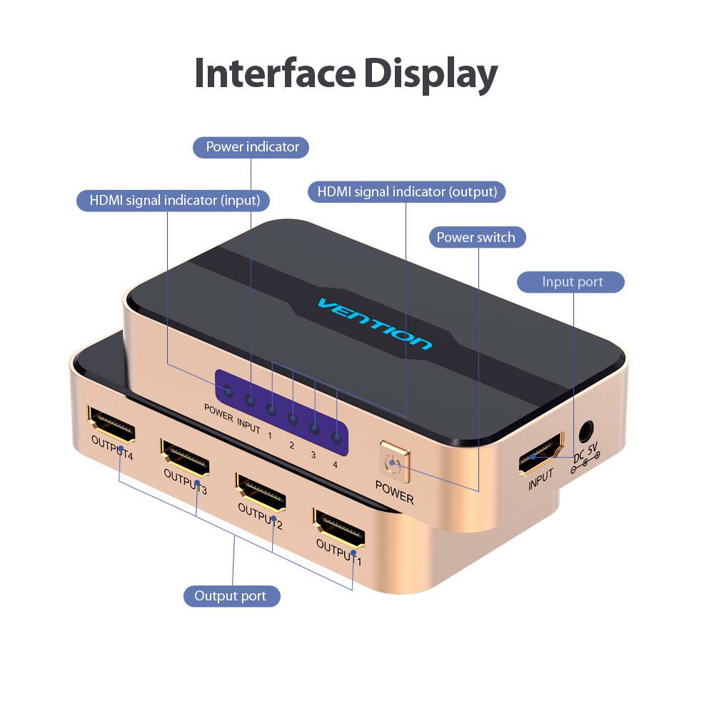 Splitter Hdmi 1×4 / 4K / Con alimentacion / Aluminio / Vention / Negro – Dorado / ACCG0-EU